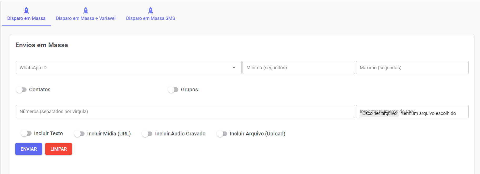 Para realizar disparos em massa você deve navegar até a opção disparos em massa no menu do Usuário.